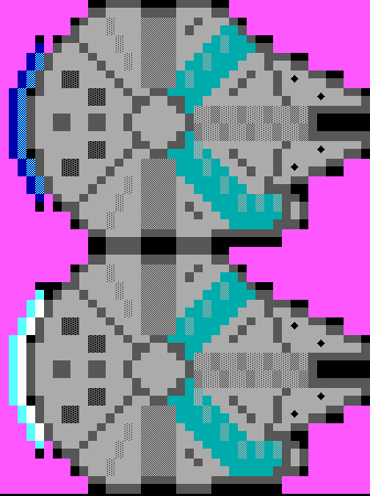 Here’s how the Falcon sprite turned out. It has only two states. The second state shows the engines lit up and is used at the end when the Falcon accelerates away.